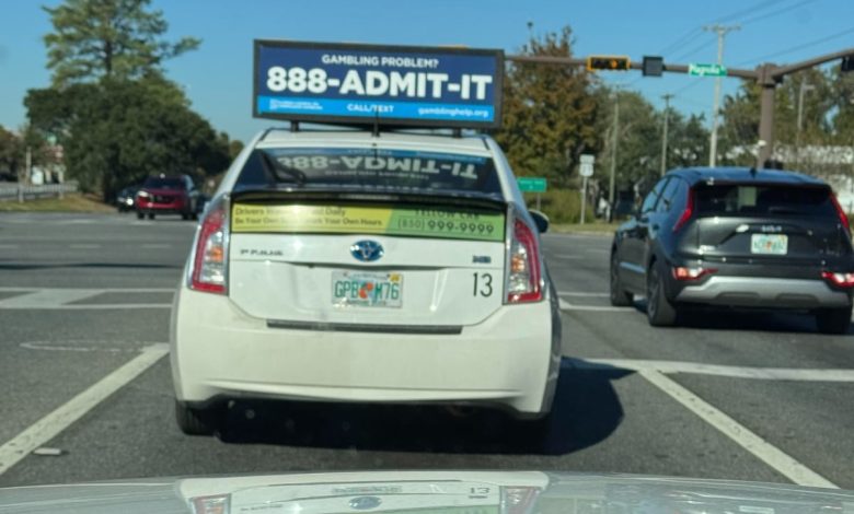 A digital billboard atop a taxi in Florida advertises the 888-ADMIT-IT downside playing helpline. The toll-free quantity connects callers with the Florida Council on Compulsive Playing. (Picture: Florida Council on Drawback Playing)