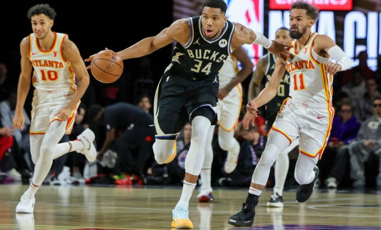 Giannis Antetokounmpo (#34) of the Milwaukee Bucks brings the ball up the courtroom in opposition to Trae Younger (#11) of the Atlanta Hawks throughout a semifinal recreation within the 2024 Emirates NBA Cup at T-Cellular Area on Dec. 14, 2024, in Las Vegas. (Picture: Ethan Miller/Getty)