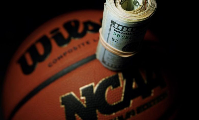 A wad of money is stacked on an NCAA basketball. NCAA sports activities betting guidelines will stay in place after the governing physique of collegiate sports activities modified course on a proposed modification to permit student-athletes to guess on skilled sports activities. (Picture: Shutterstock)