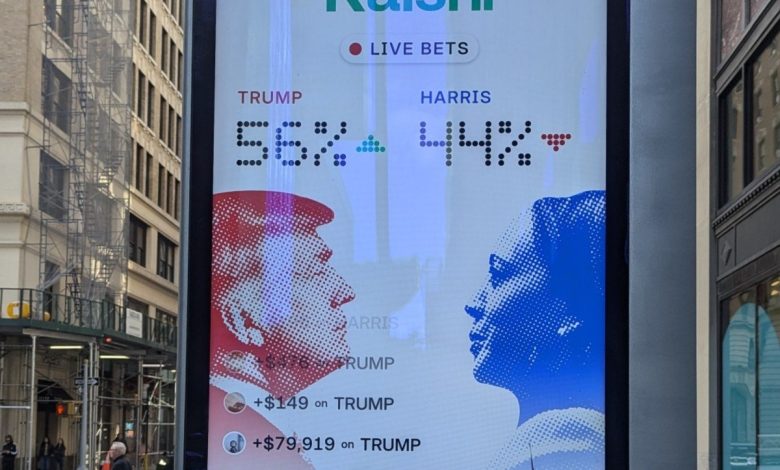 A digital billboard in New York Metropolis reveals Kalshi’s odds for the 2024 presidential election on Oct. 16, 2024. Gaming regulators in Nevada are warning licensees that they can not function sports activities occasion contracts with no sports activities betting license. (Picture: Shutterstock)