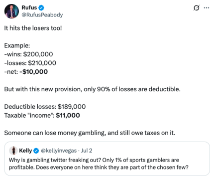 “Somebody can lose cash playing, and nonetheless owe taxes on it,” Peabody posted on X.