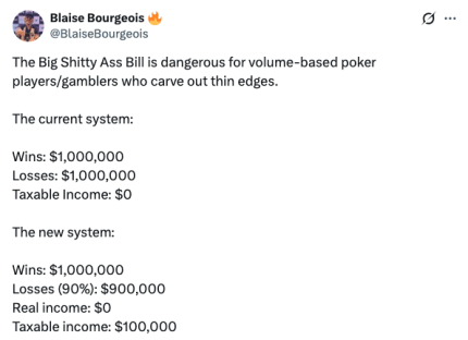 “If the 2026 Playing Tax change shouldn’t be repealed, I cannot be enjoying on-line poker subsequent yr,” Kaye wrote on X. Kaye broke down how the One Huge Lovely Invoice wagering tax would affect him in a hypothetical state of affairs.