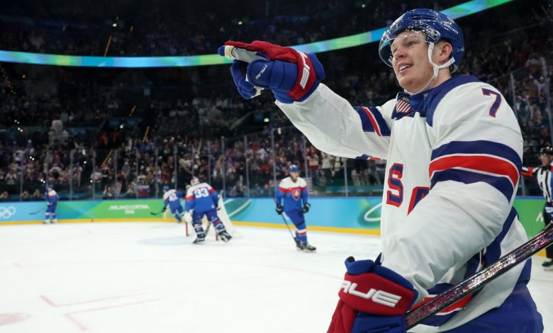 Brady Tkachuk of Group United States celebrates after scoring a aim through the Males’s Semifinal between the U.S. and Slovakia on the Milano Cortina 2026 Winter Olympic video games at Milano Santagiulia Ice Hockey Enviornment yesterday in Milan, Italy. (Picture: Elsa/Getty Photos)